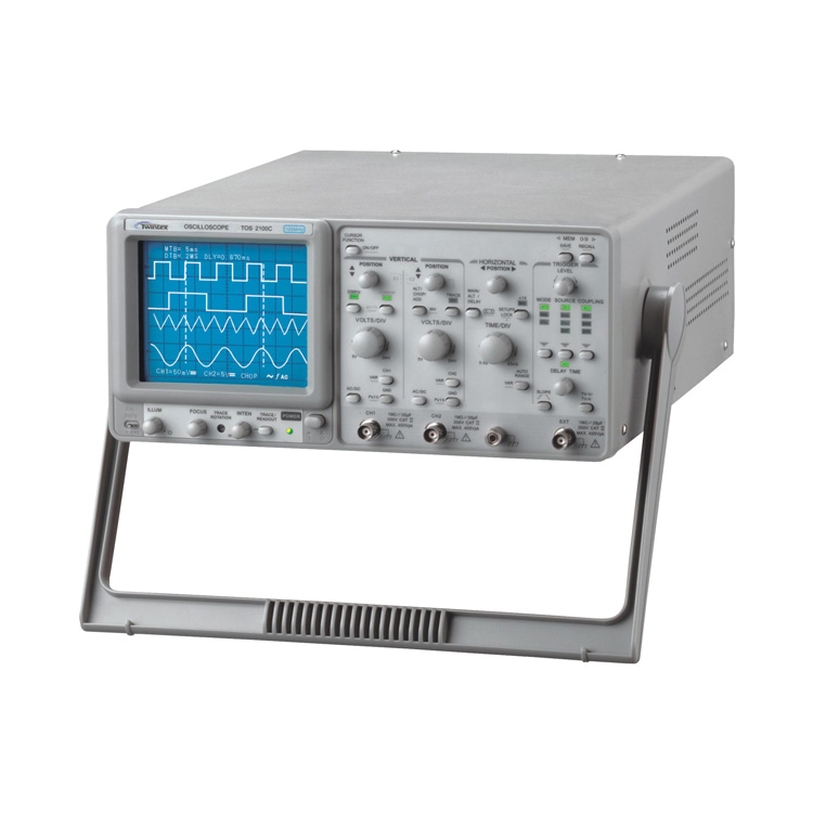 TOS-2100C is dual trace 100MHz analog oscilloscope that uses cathode ray tube to display signal waveforms. Screen illumination of the 100MHz oscilloscope is continuously adjustable. The analog oscilloscope 100MHz has delayed sweep function and cursor readout function. The 100MHz analog oscilloscope provides panel lock function to avoid wrong operation.